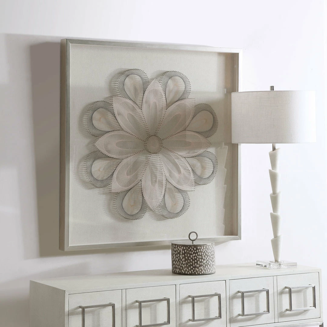 This Statement Making Shadow Box Features 3-dimensional Layered String Art, Hand Threaded Around Individually Hammered Pin Nails In Shades Of Slate Gray, Tan And Blush, Over A Neutral Linen Backing With A Silver Leaf Frame.