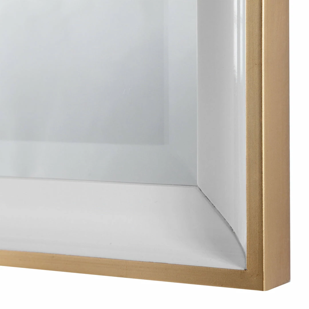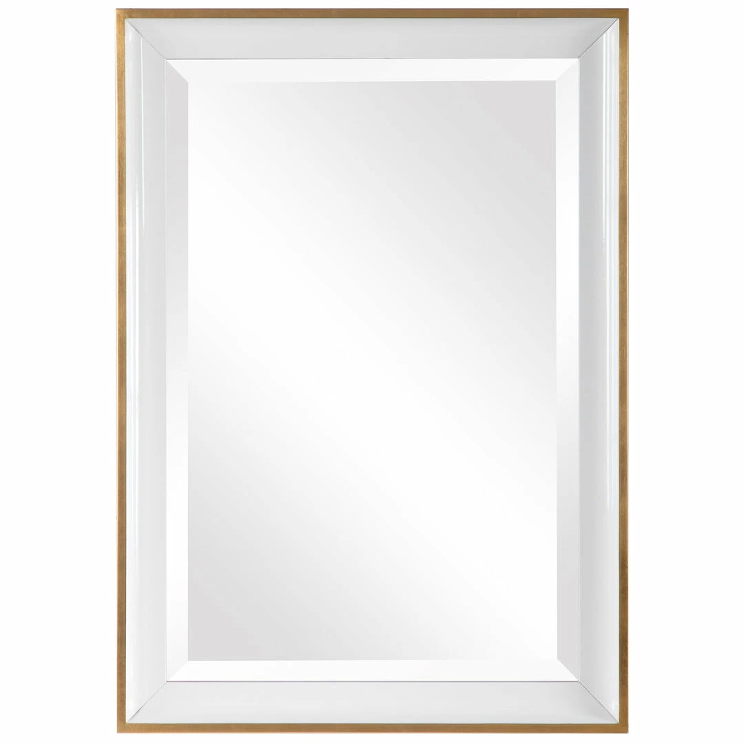 This Elegantly Refined Design Has A Large Gloss White Inner Frame Accented By A Petite Gold Leaf Outer Frame. The Mirror Has A 1″ Bevel And May Be Hung Horizontal Or Vertical.