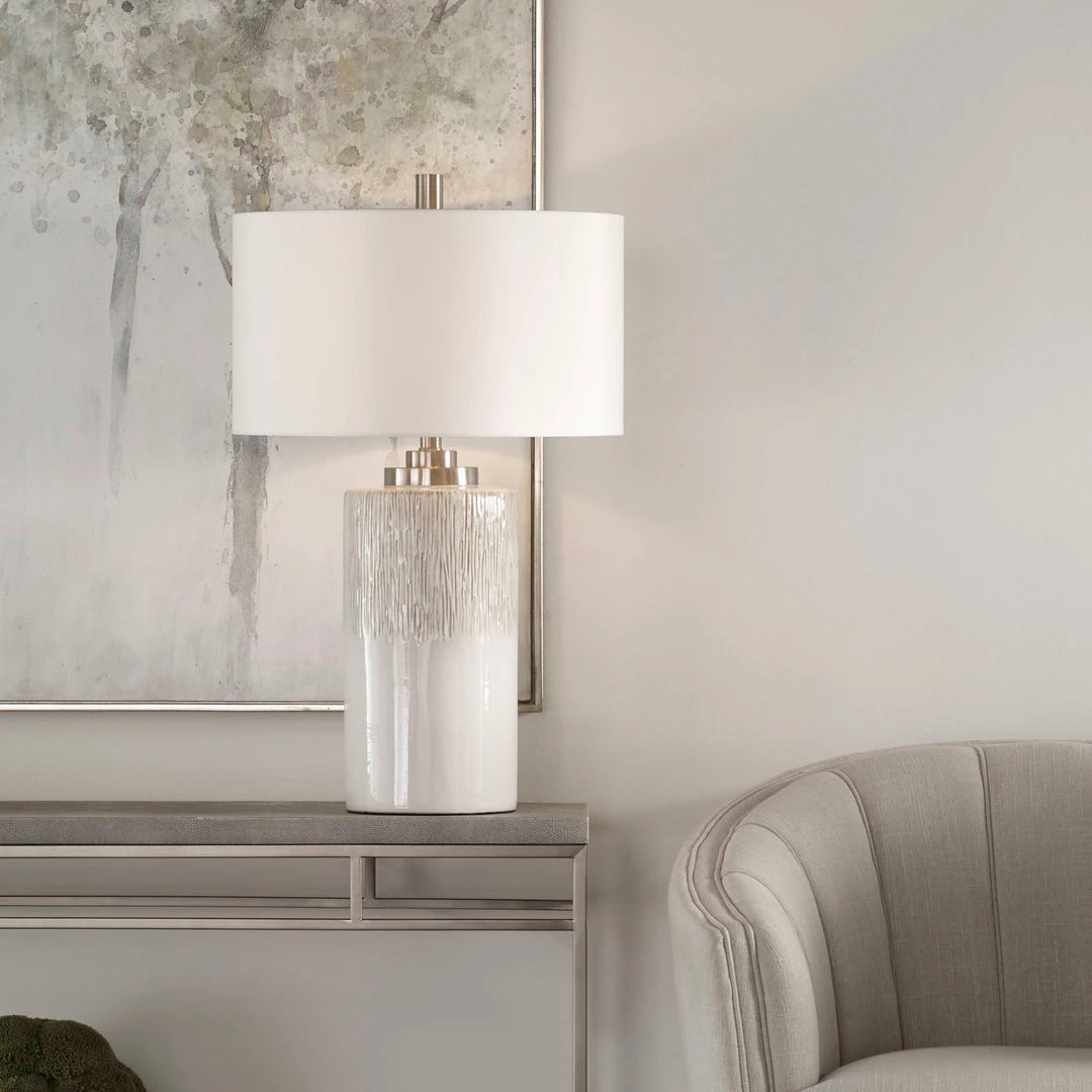 This Lamp Showcases An Aged White Ceramic Base Accented With Charcoal Flecks And Textured Beige Drip Details. Brushed Nickel Hardware Is Paired With This Piece. The Round Hardback Shade Is A White Linen Fabric. Due To The Nature Of Fired Glazes On Ceramic Lamps, Finishes Will Vary Slightly.