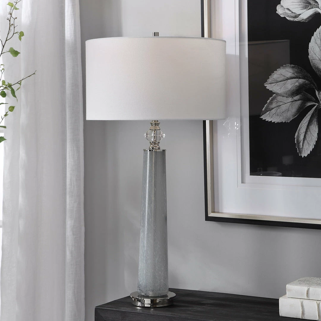 This Sleek Table Lamp Features A Frosted Art Glass Base In Light Gray With White Speckled Texture. The Piece Is Accented By Polished Nickel Details And A Crystal Ornament. The Hardback Drum Shade Is Covered In A White Linen Fabric.
