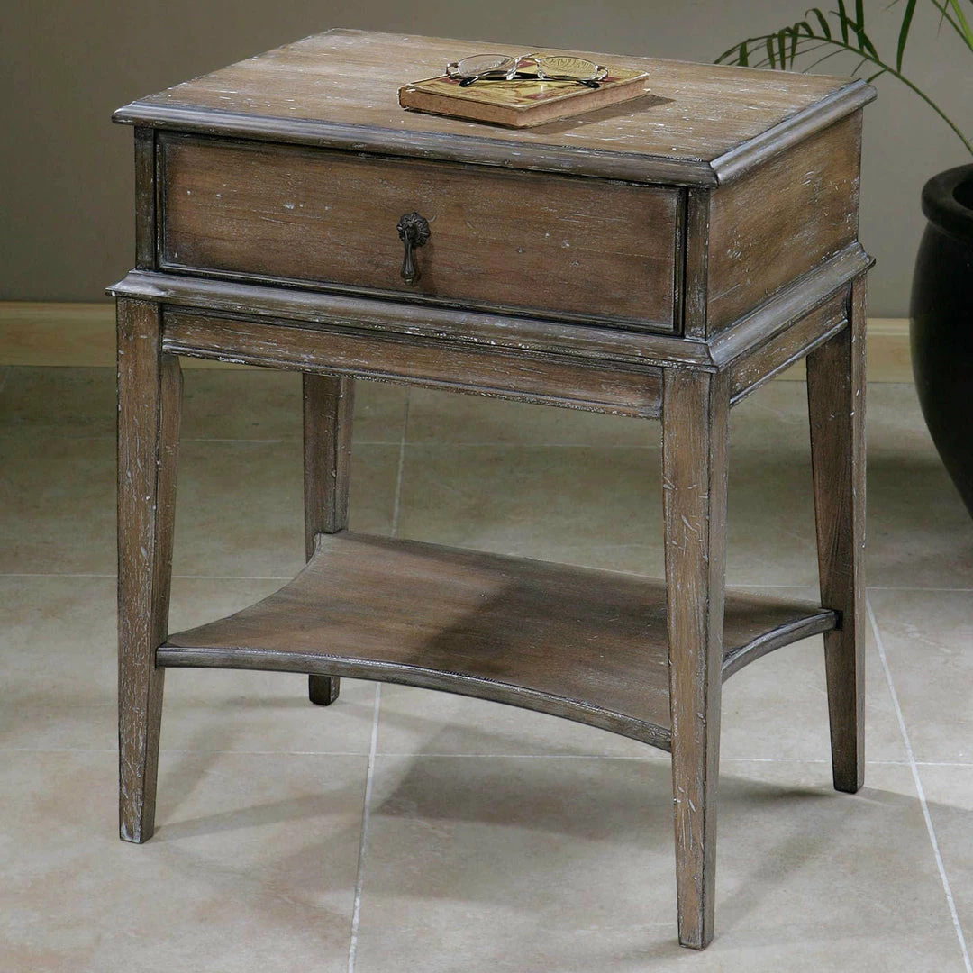 A Casual Side Table With Functional Storage Featuring Sun-washed Weathered Pine With Burnished Edges And A Light Antiquing Glaze, Accented With An Aged Iron Finished Drawer Pull.