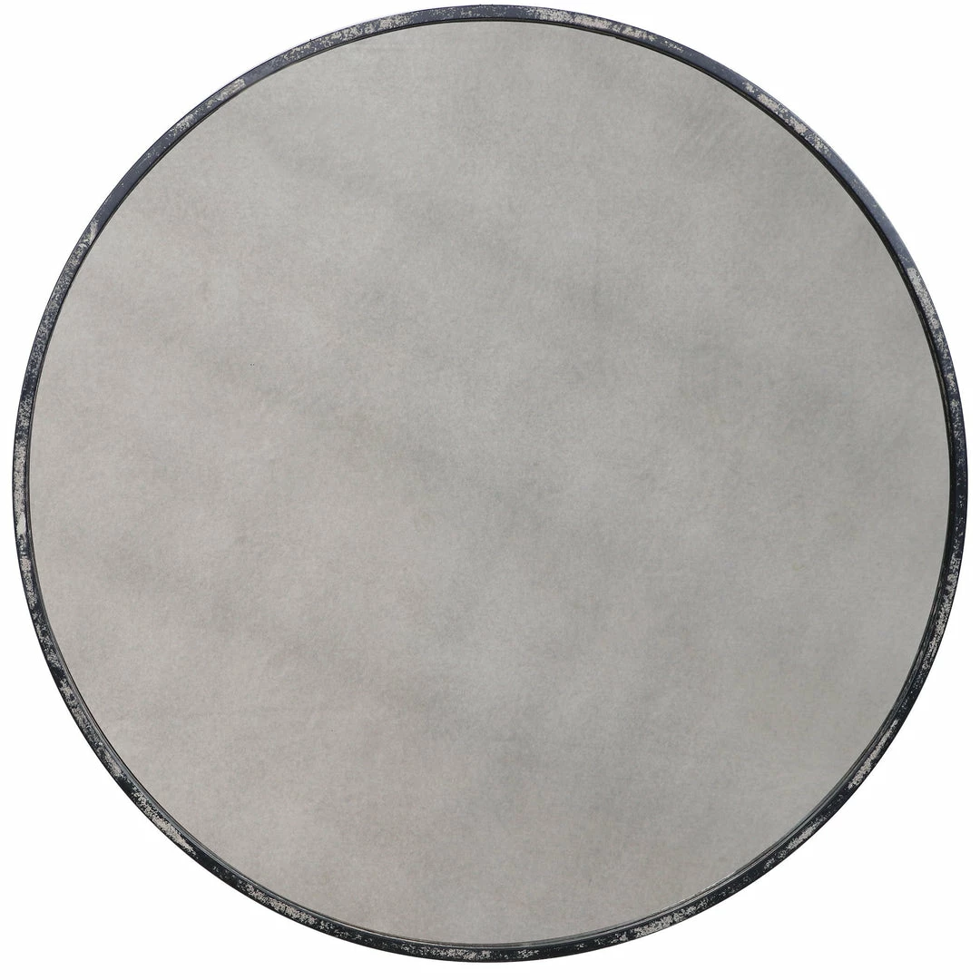 Industrial Style Round Mirror Features A Petite Metal Frame Finished In Rustic Black With Aged White Distressing, Surrounding An Antique Style Mirror.