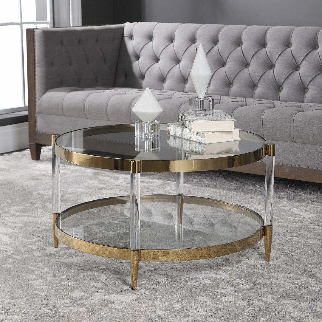 A True Glam Accent, Featuring A Gold Plated Stainless Steel Frame With Clear Glass, Acrylic Legs And Tapered Feet.