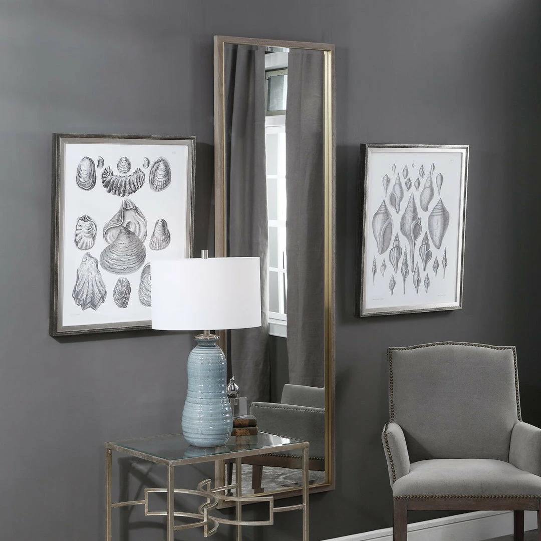 Contemporary In Style, This Mirror Features A Light Gray Wooden Frame With A Brushed Brass Inner Liner. This Piece Has A 1 1/4″ Bevel And May Be Hung Horizontal Or Vertical.