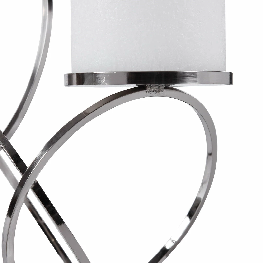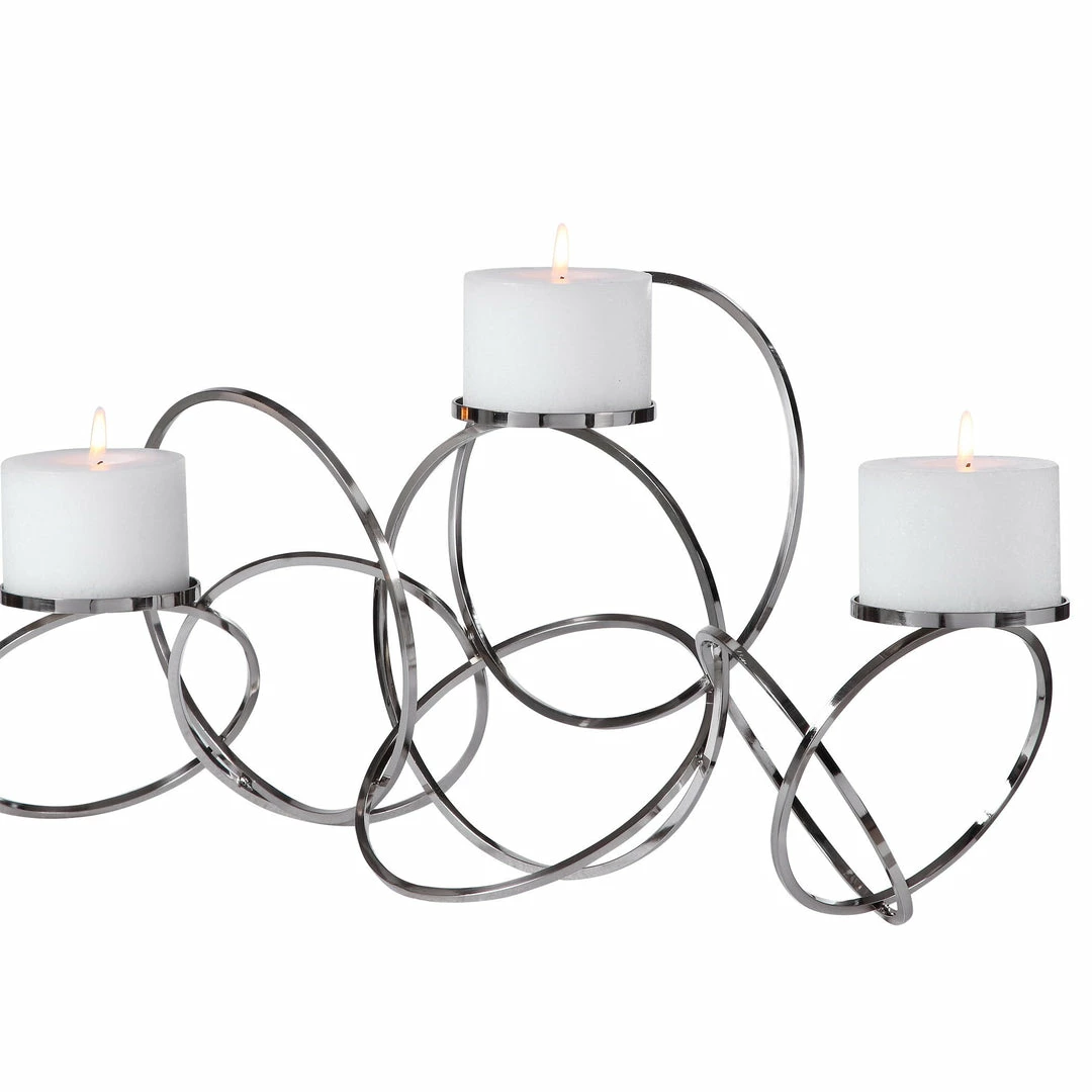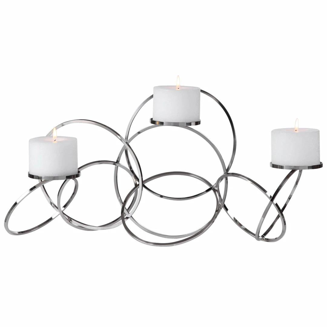 Modern Candleholder Features An Intertwined Ring Design And Is Finished In Polished Nickel. Three 4″x 3″ White Candles Are Included.