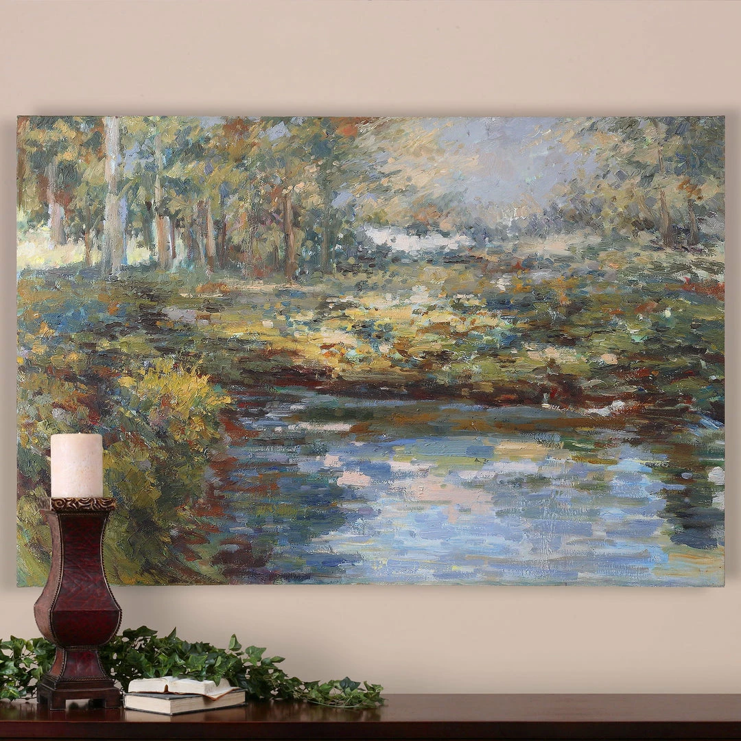 Reminiscent Of Impressionist Style Artwork, This Hand Painted Oil On Canvas Showcases A Timeless, Landscape Design. The Frameless Piece Is Awash In Blue, Green, White, And Bronze Tones. The Canvas Is Stretched And Attached To Wood Stretching Bars. Due To The Handcrafted Nature Of This Artwork, Each Piece May Have Subtle Differences.