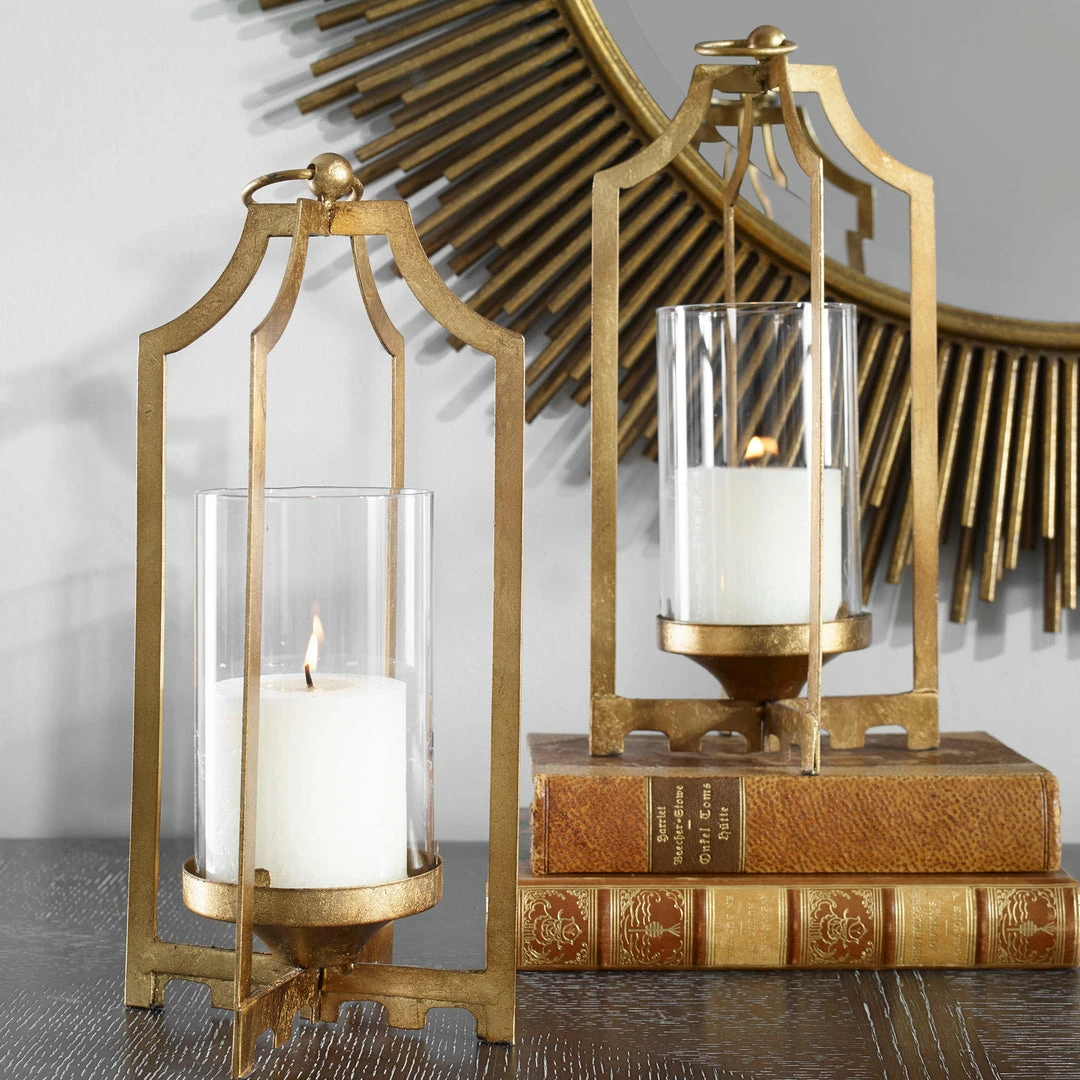 Bright, Metallic Gold Metal With Clear Glass Globes And Two 3″x 3″ Distressed Off-white Candles.