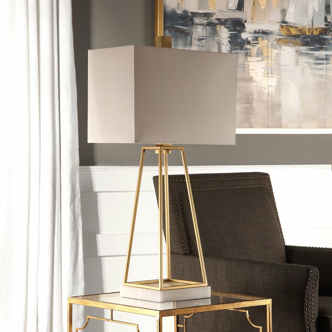 This Linear Design Features A Clean Line Tapered Steel Cage Finished In Plated Metallic Gold, Displayed On A White Marble Foot. The Rectangle Hardback Shade Is A White Linen Fabric.
