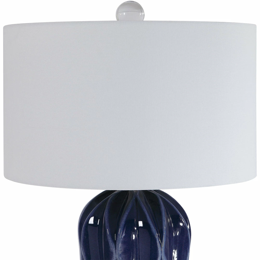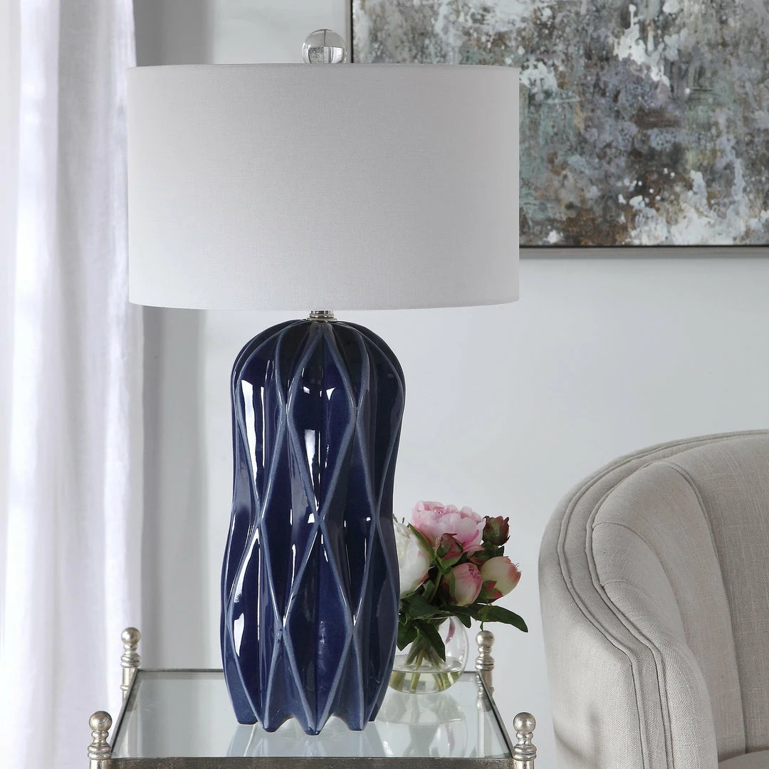 Showcasing A Modern Style, This Ceramic Table Lamp Features An Embossed Geometric Pattern In A Glossy, Deep Cobalt Hue With Subtle Rub-through. Polished Nickel Details And A Crystal Finial Are Paired With This Design. A Round Hardback Shade In White Linen Fabric Complements This Piece.