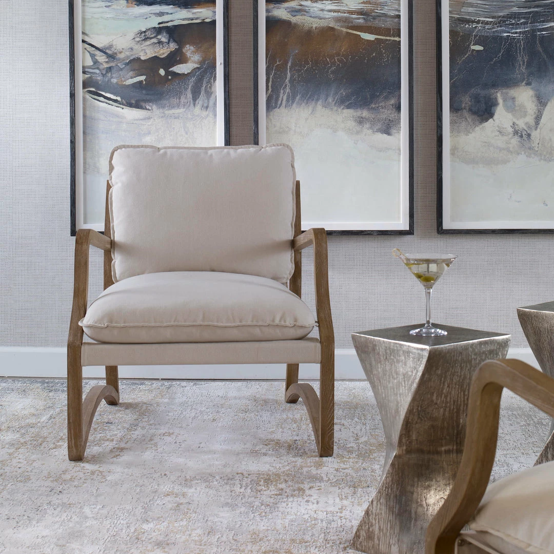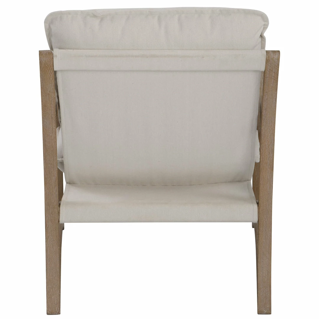 Modern Yet Casual, This Stylish Accent Chair Boasts A Sculptural Open Frame Made From Solid Oak In A Natural Wire Brush Ceruse Finish. Each Plush Cushion Is Upholstered In A Natural Linen Toned Fabric, In A Sling Seat Perfect For Lounging. Seat Height Is 18″.