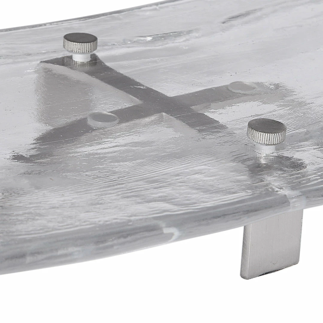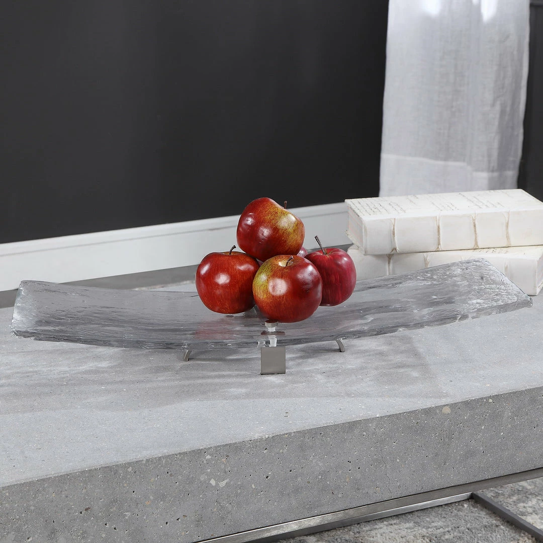 Clear Art Glass Tray Features A Slight Curve To The Glass And Is Displayed On A Brushed Nickel, Open Arch Base.