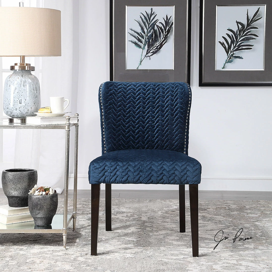 A Statement Accent Upholstered In A Rich Ink Blue Polyester Velvet Featuring A Herringbone Embroidered Texture, Complete With Polished Nickel Nail Head Trim. Birch Legs Stained In A Deep Walnut. Seat Height Is 21″. Sold As A Set Of 2.