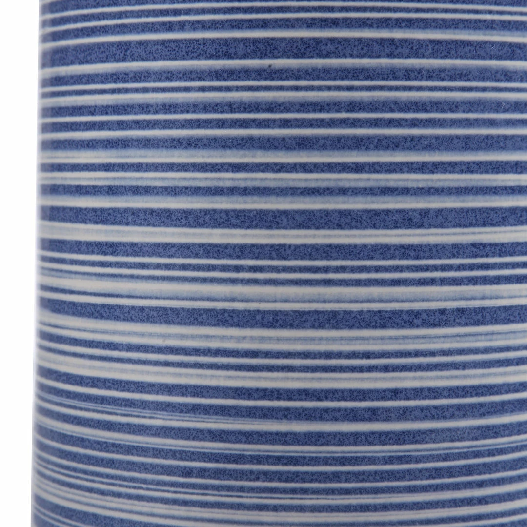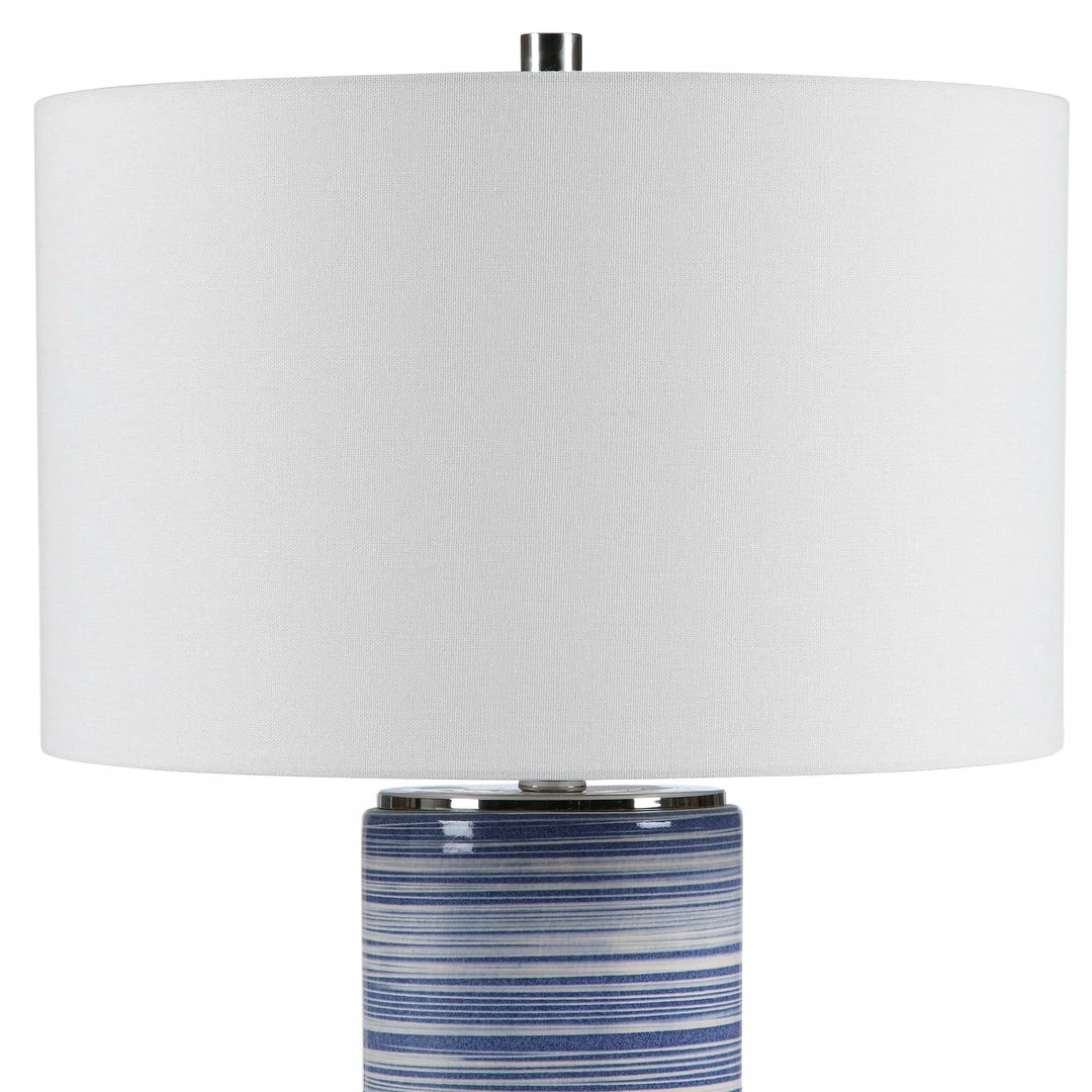 Showcasing Trendy White And Indigo Hues, This Ceramic Table Lamp Has A Striped Glaze With Polished Nickel Accents. The Round Hardback Drum Shade Is A White Linen Fabric.