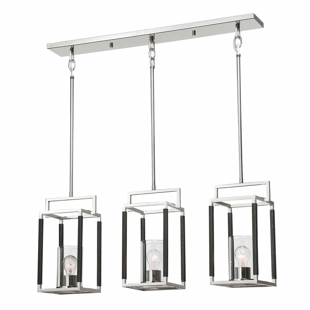The Clean Geometric Rectangular And Square Lines In Polished Nickel On Our 3 Lt. Linear Pendant Are Enhanced With Hand Sewn Textured Black Leather Accents. With 3-60 Watt Max, Edison Sockets And Includes 15′ Wire, 9-12″ Stems And 3-6″ Stems For Adjustable Installation.