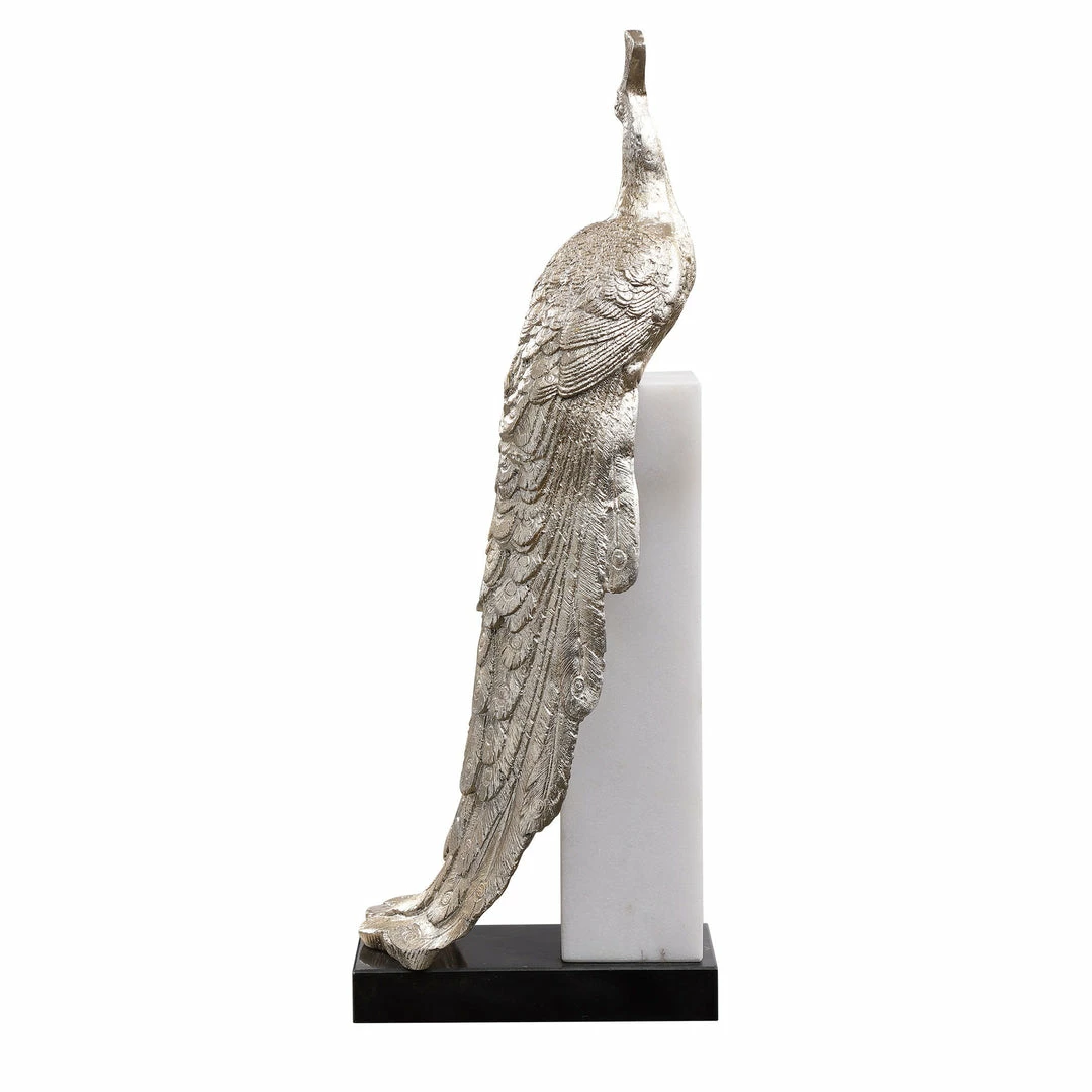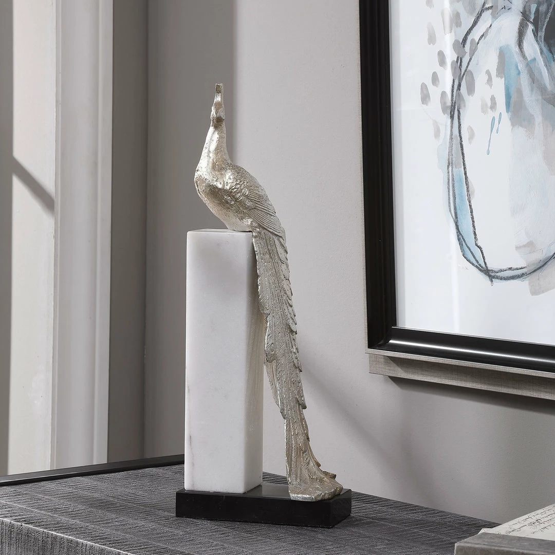 Traditional And Elegant, This Peacock Sculpture Features A Champagne Silver Bird Atop A White Marble Column With A Black Marble Base.
