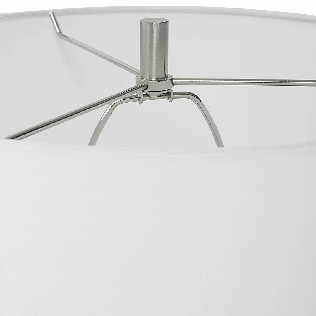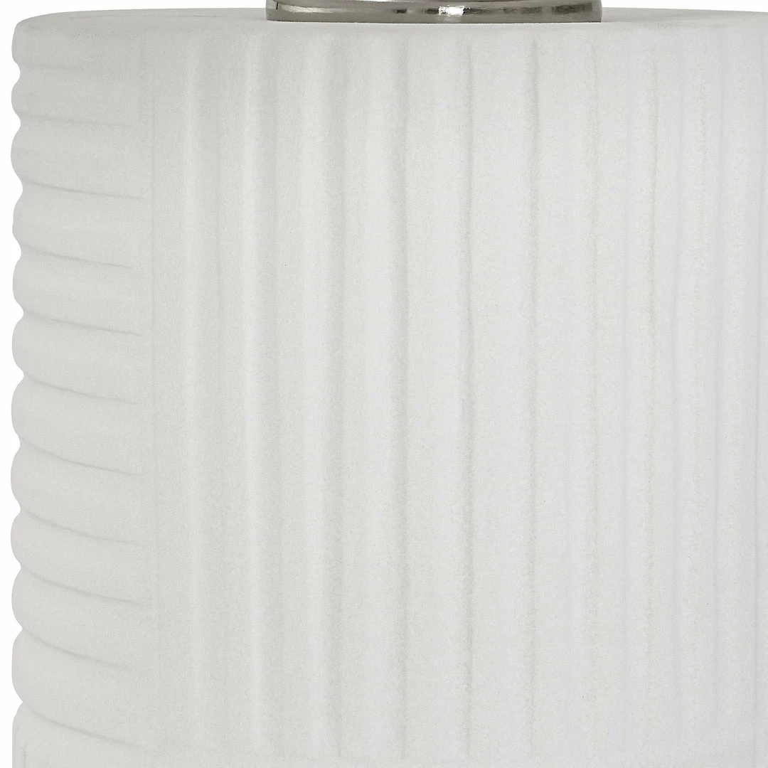 This Cylinder Ceramic Table Lamp Features Alternating Linear Ridges Finished In A Stylish Satin White Glaze With Brushed Nickel Plated Iron Details. The Hardback Drum Shade Is Covered In A White Linen Fabric.