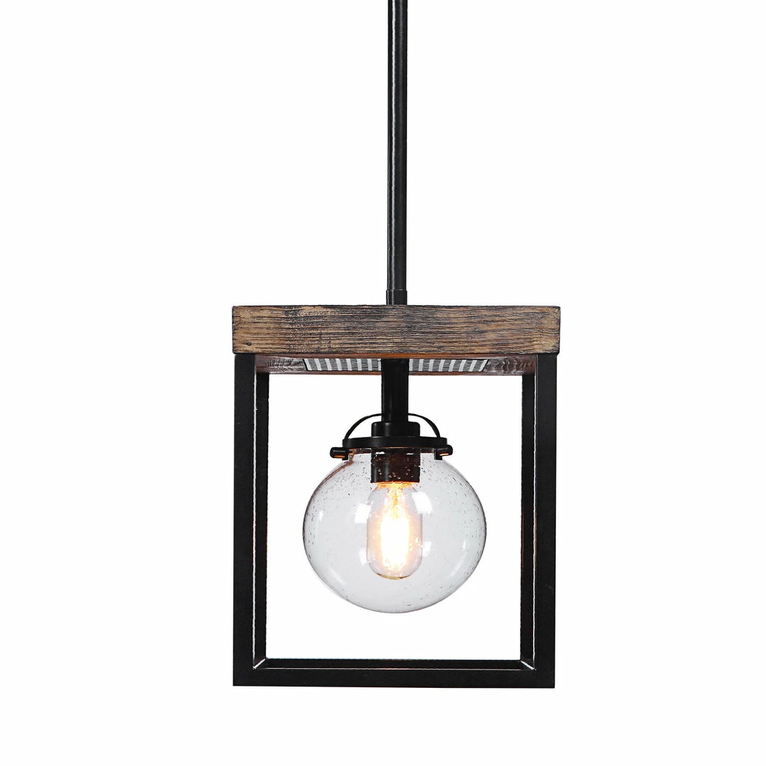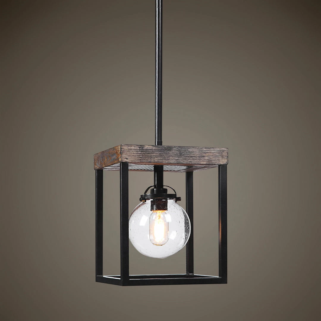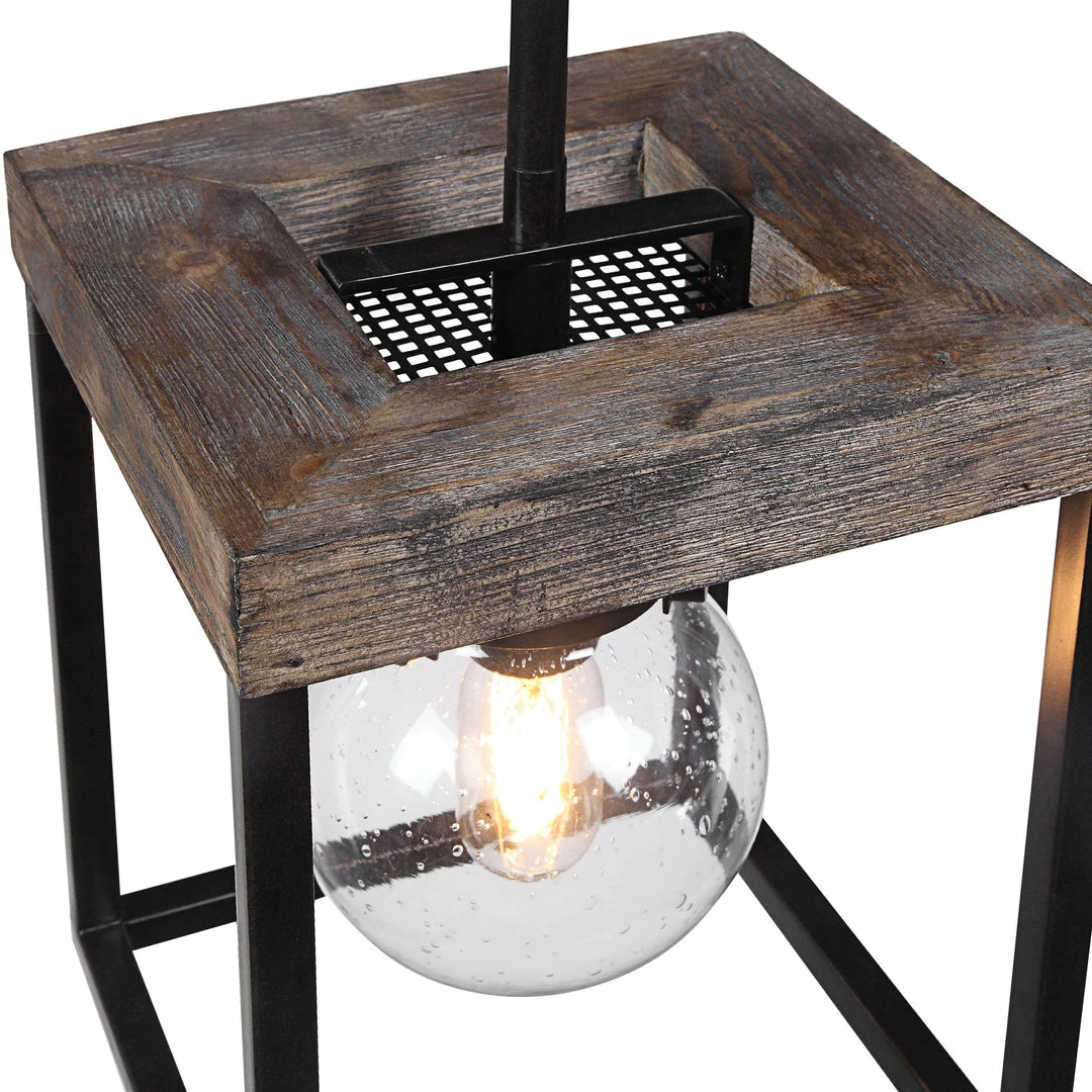 A Combination Of Both Refined Rustic And Industrial Elements Featuring A Textured Black Metal Finish With Distressed Wood Evoking A Medium Tone Walnut For This 1 Lt. Mini Pendant. The Clear Seeded Glass Globe And The Top Punched Metal Add To The Overall Abundance Of Details. With 1-60 Watt Max, Edison Socket And Includes 1-40 Watt Clear T45 Antique Style Bulb. Supplied With 15′ Wire, 3-12″ Stems And 1-6″ Stem For Adjustable Installation.
