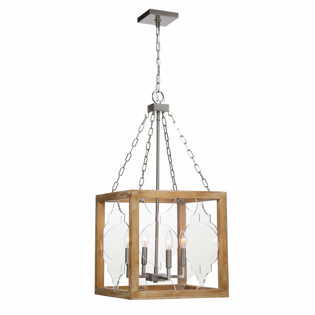 White Taupe Lightly Washed Wooden Lantern With Brushed Nickel Accents Featuring Acrylic Quatrefoil Cut Outs Adding Unique Updated Look. With 4-60 Watt Max, Candelabra Sockets And Includes 12′ Wire And 5′ Chain For Adjustable Installation.