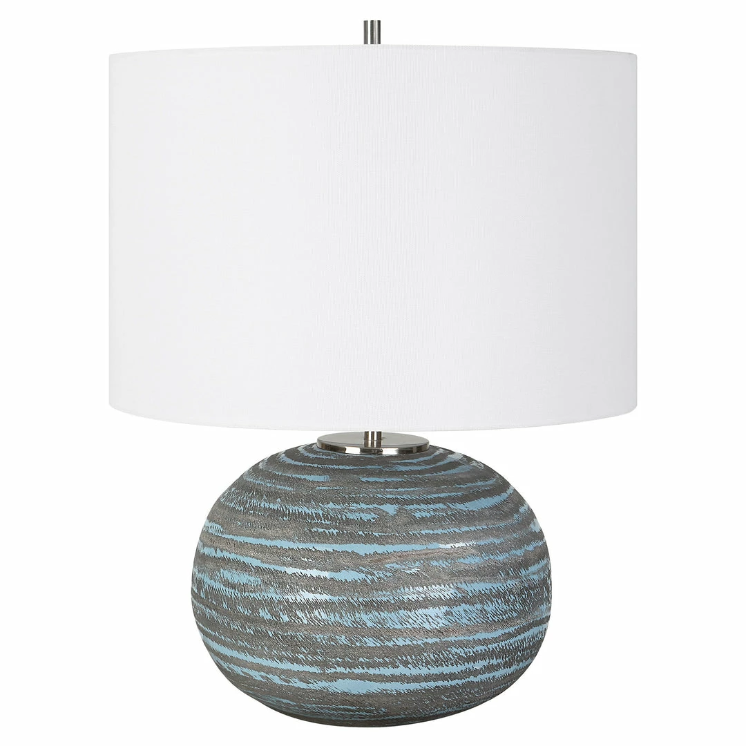 This Ceramic Table Lamp Displays A Bohemian Flair With A Light Aqua Blue Crackle Glaze And Scratched Gray Textured Details, Paired With Nickel Plated Accents. A Crisp White Hardback Shade Accentuates This Piece.