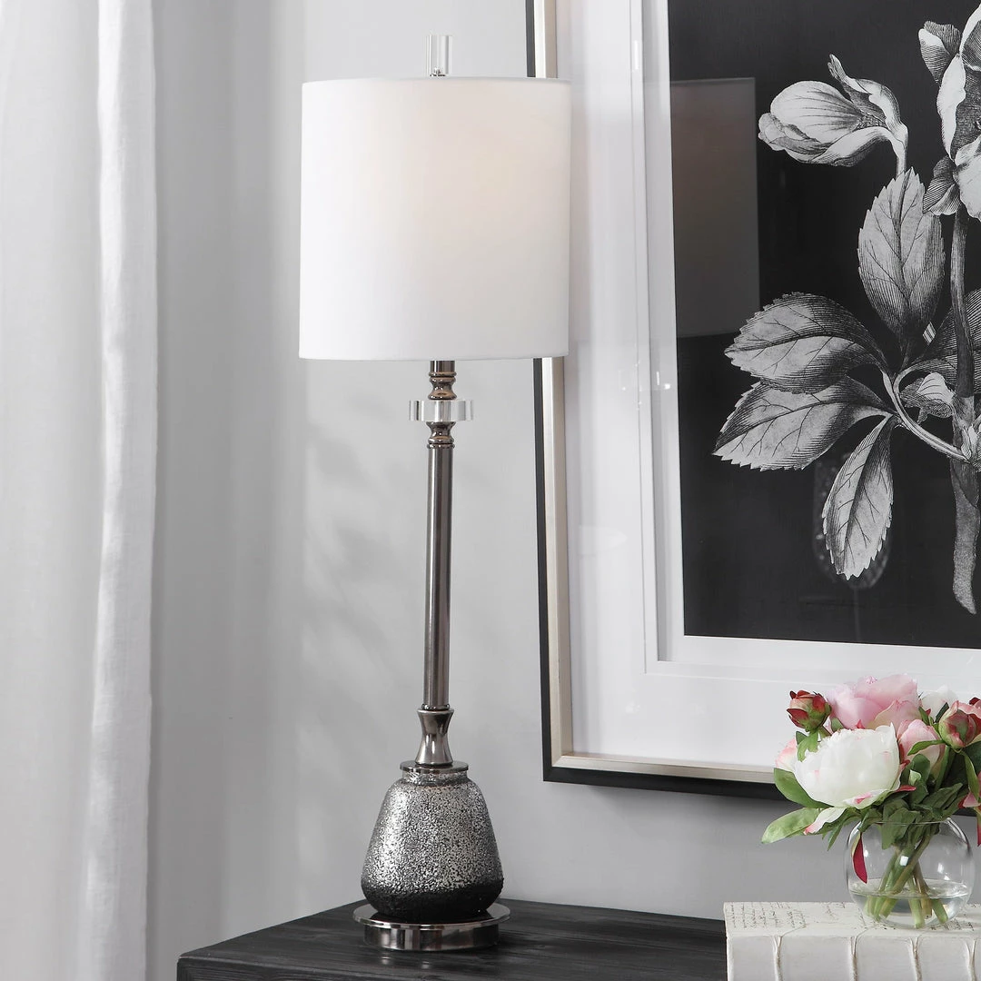 This Delicate Buffet Lamp Features A Textured Ceramic Base Finished In A Metallic Silvery Bronze Glaze, Paired With Black Nickel Plated Details And Crystal Accents. The Round Hardback Shade Is A White Linen Fabric.