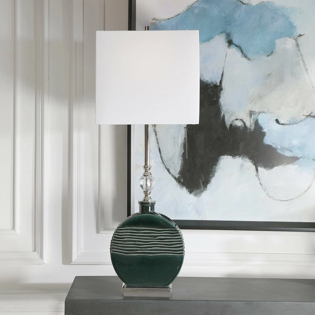 An Updated Take On Traditional Style, This Buffet Lamp Features A Dark Teal Ceramic Base With Raised Organically Shaped Ridges, Accented With Polished Nickel Plated Details And A Crystal Ornament. A Petite White Linen Fabric Square Shade Complements The Piece.