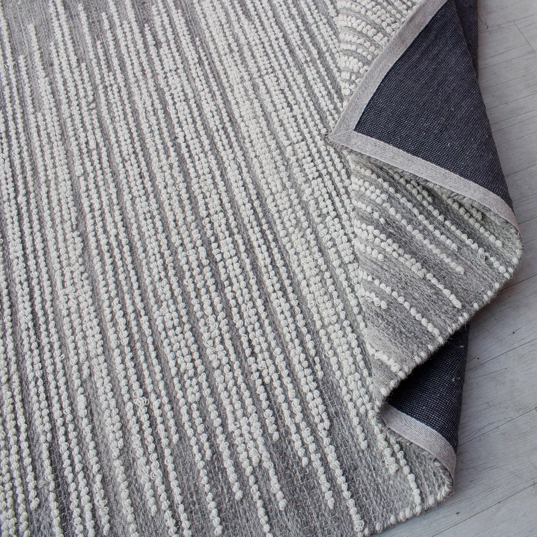 This Hand Woven Rug Features Natural Undyed Gray Wool With Looped Ivory Raised Details.