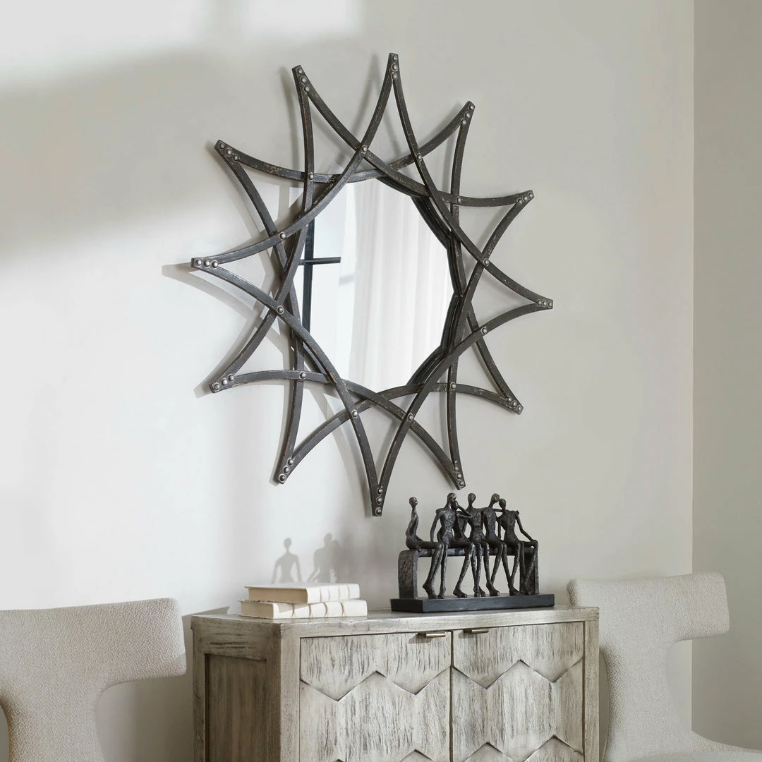 Handcrafted From Forged Iron, This Mirror Showcases A Star-shaped Frame Finished In An Aged Crackled Charcoal With A Light Gray Glaze And Antiqued Silver Rivet Like Accents.