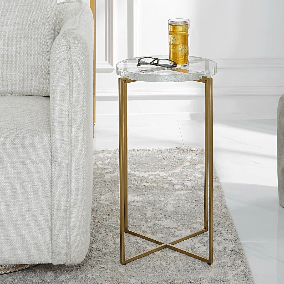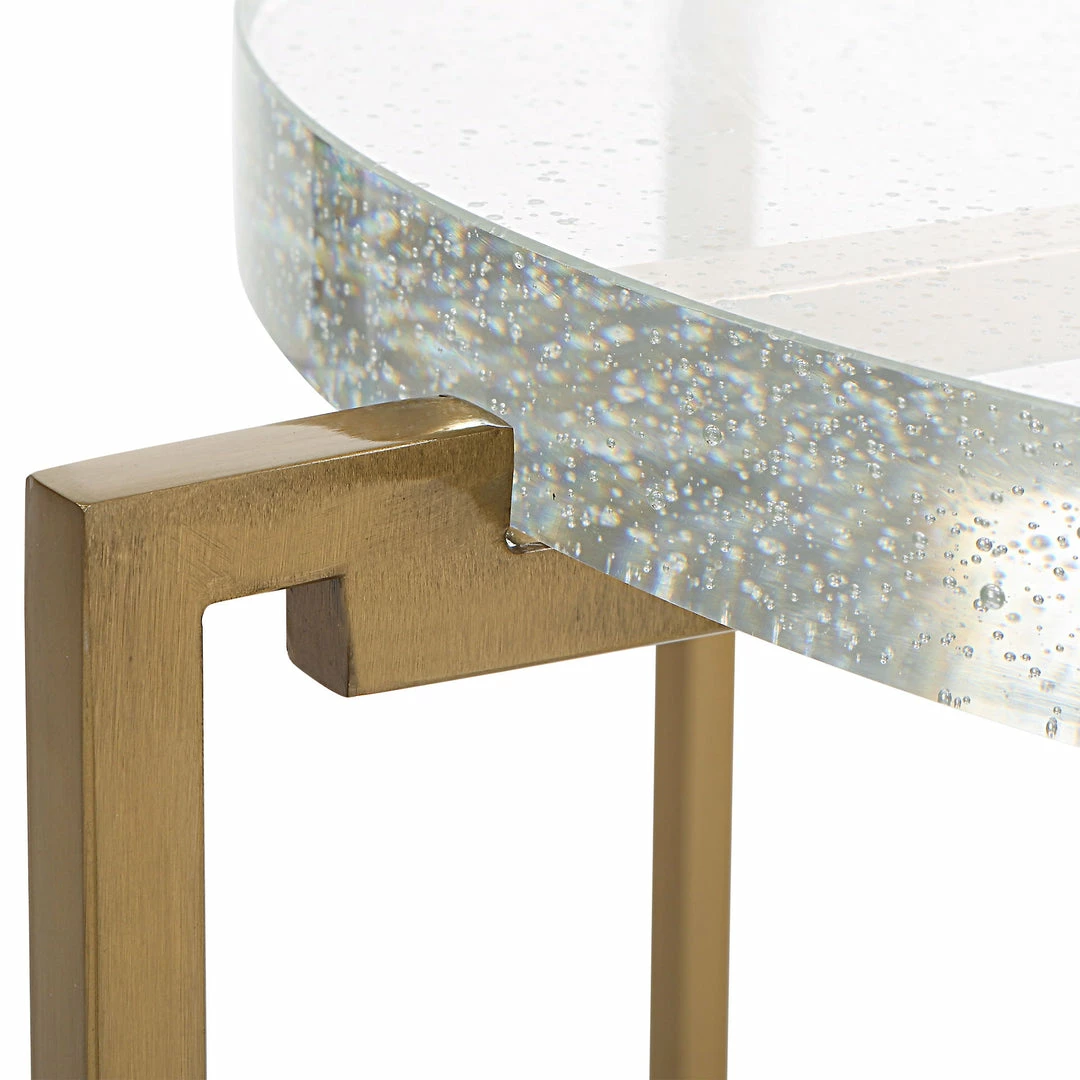 Sleek And Sophisticated, This Accent Table Showcases A Petite Stainless Steel Frame Finished In Brushed Gold And Is Accented By A Thick Seeded Glass Top.