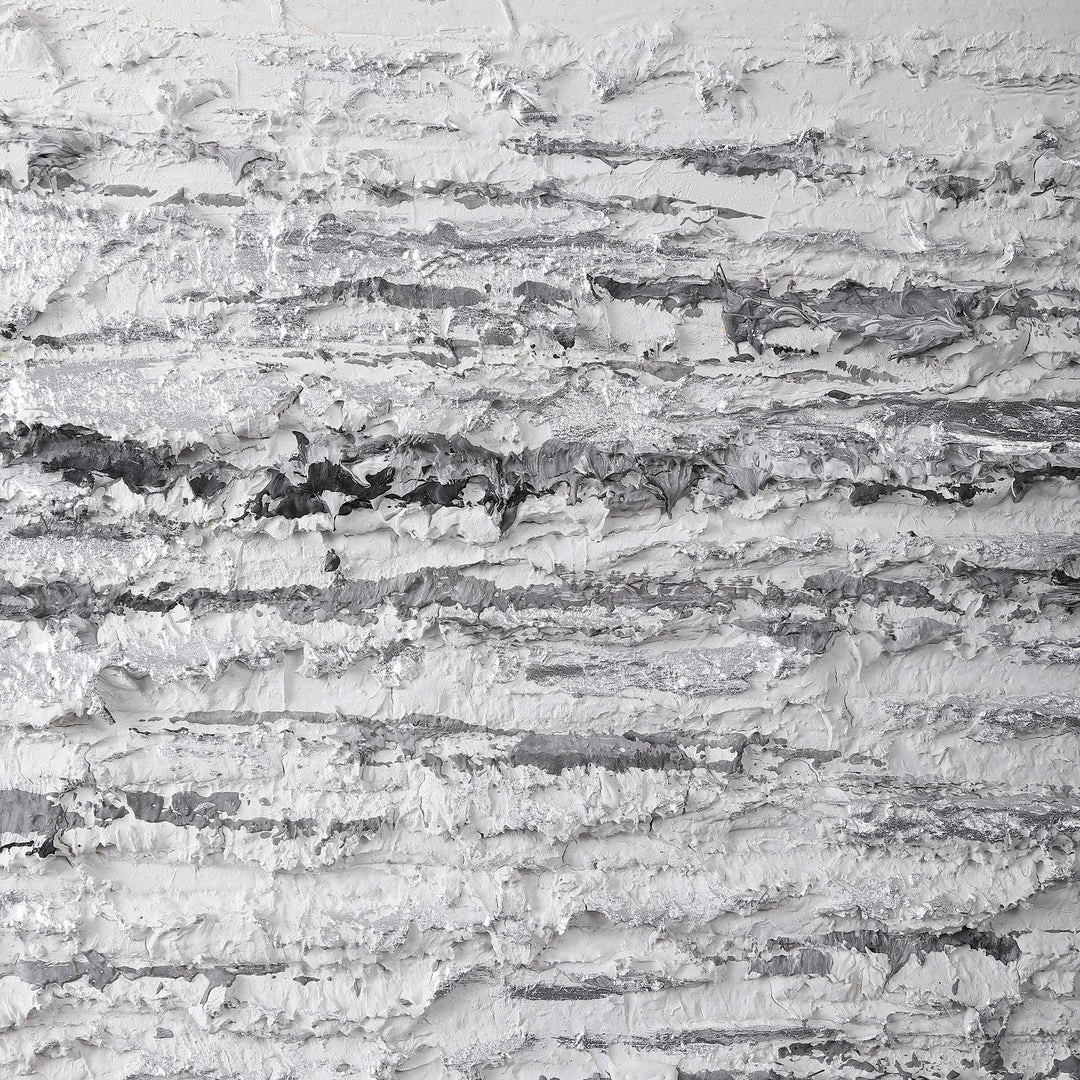 Stylish And Sophisticated, This Hand Painting Has Noticeable Textural Accents With Light Gray, Charcoal And Silver Leaf Tones Working Together To Create The Perfect Neutral Artwork. A White Border And Silver Gallery Frame Accent The Piece. Due To The Handcrafted Nature Of This Artwork, Each Piece May Have Subtle Differences.