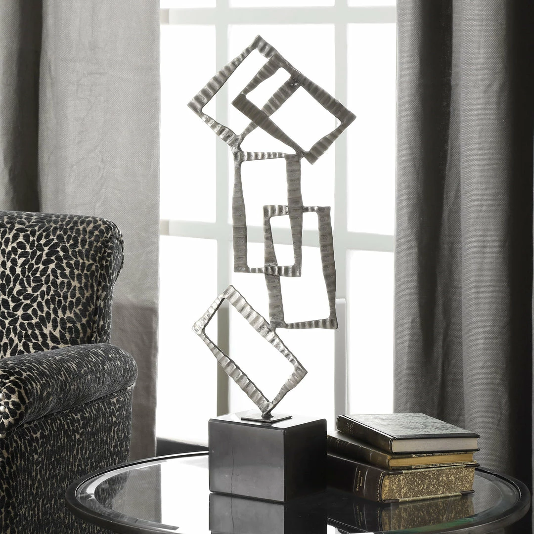 Randomly Stacked, Crimped Edge, Cast Iron Rectangles Finished In A Lightly Antiqued Brushed Nickel, Displayed On A Black Marble Base.