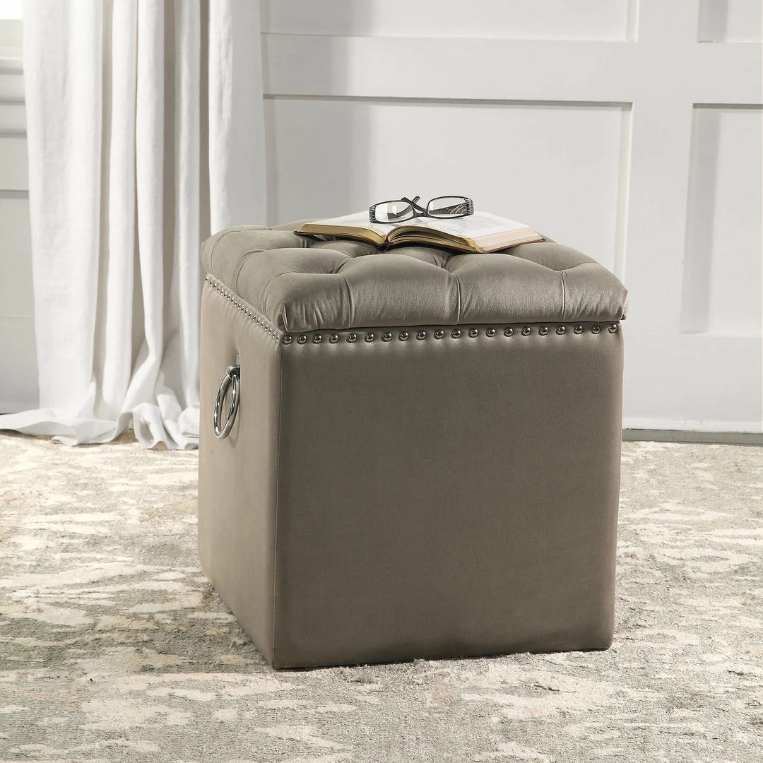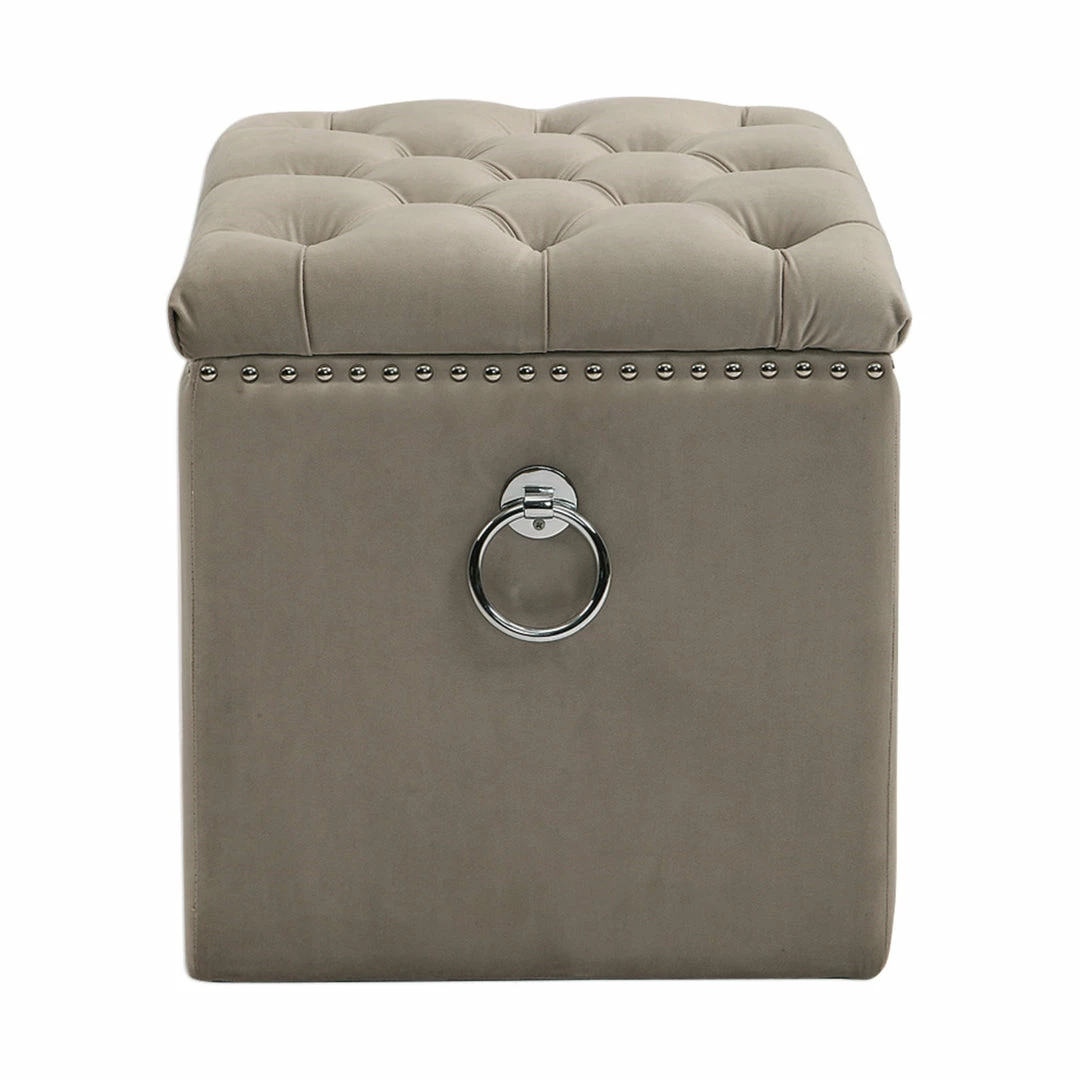 Covered In A Luxurious Champagne Velvet, This Plush Button Tufted Lid Opens Up For Concealed Storage With An Interior Safety Hinge. Complete With Polished Nickel Ring Pulls And Nail Head Trim.