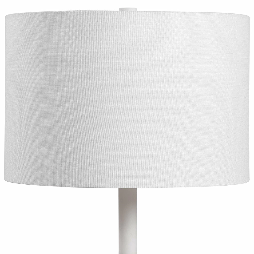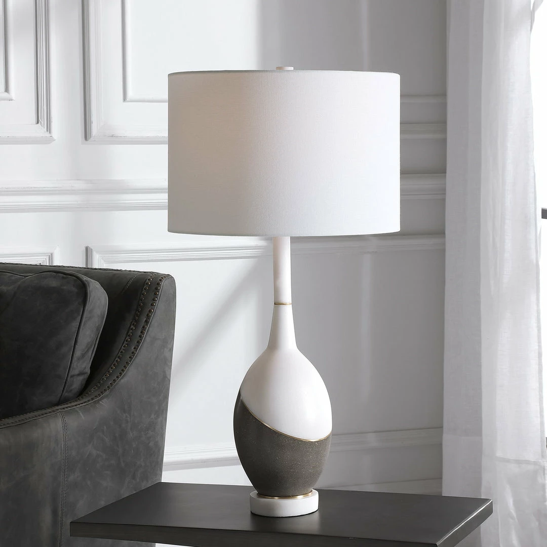 Simple Yet Sophisticated, This Table Lamp Features A Combination Of Honed Charcoal Concrete And A Polished White Marble Look, Accented By Brushed Gold Plated Accents. The Lamp Is Complemented By A Crisp White Hardback Drum Shade.