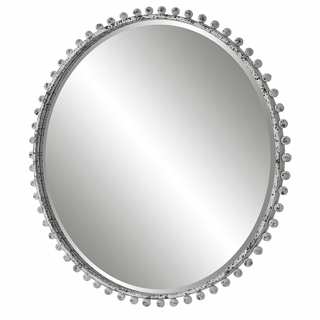 Petite Iron Spheres Line The Outer Edge Of This Round Frame, Finished In A Heavily Distressed Aged White With Rustic Black Undertones. Mirror Features A Generous 1 1/4″ Bevel.