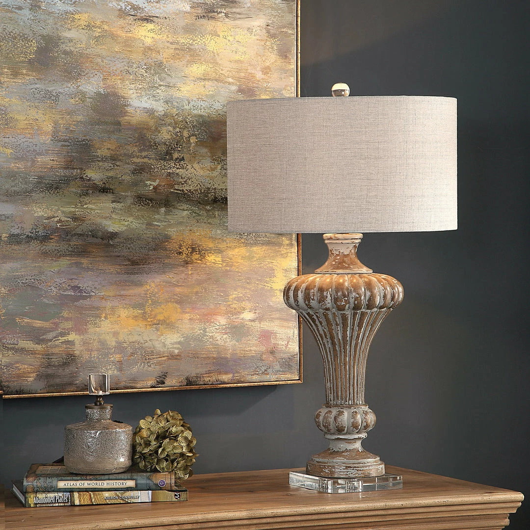 This Updated Look On An Ornate Traditional Style Features A Hand Painted Aged Pecan Finish With A Heavily Distressed Antique Gray Wash, Accented With Thick Crystal Details. The Round Hardback Drum Shade Is A Light Beige Linen Fabric With Natural Slubbing.