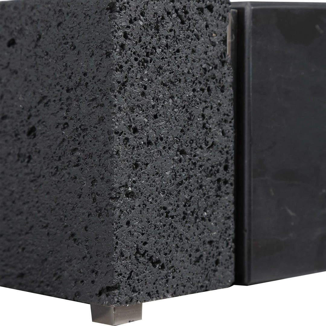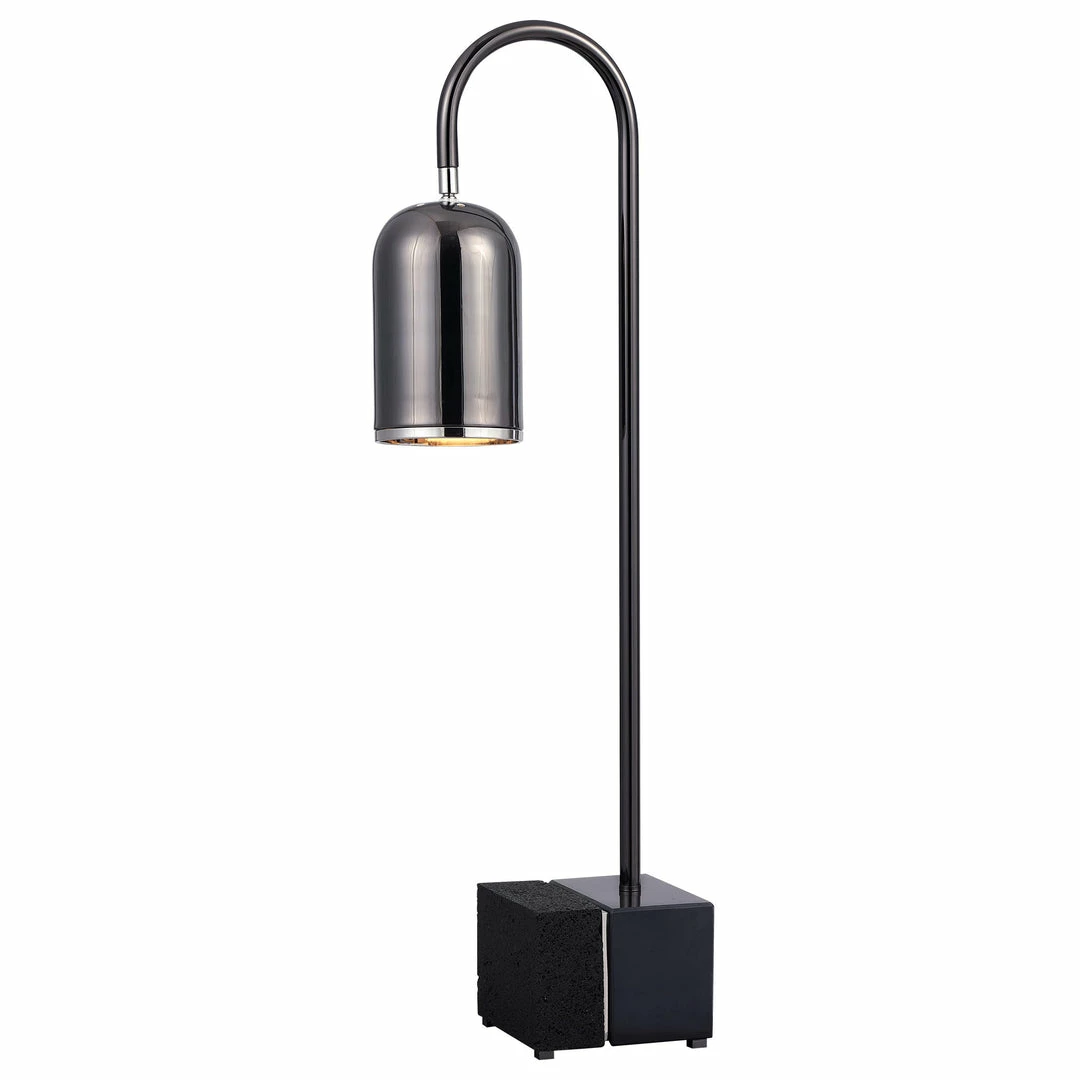 Contemporary Style Desk Lamp Showcases A Sleek Steel Base Finished In A Plated Black Nickel With A Matching Metal Shade And Polished Nickel Accents. The Block Foot Is A Combination Of Black Lava Stone And Black Marble With Subtle White Veining And Beveled Edges.