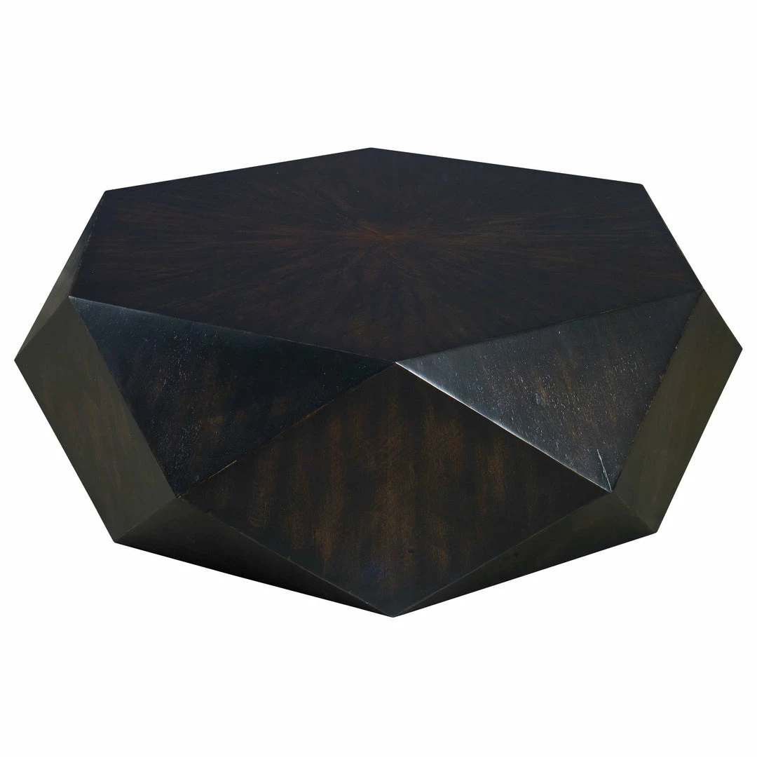 This Unique Geometric Table Features A Low Profile, Perfect For Viewing The Sunburst Top In Mango Veneer With A Worn Black Finish With Natural Distressing, Rubbed To Reveal Honey Undertones.